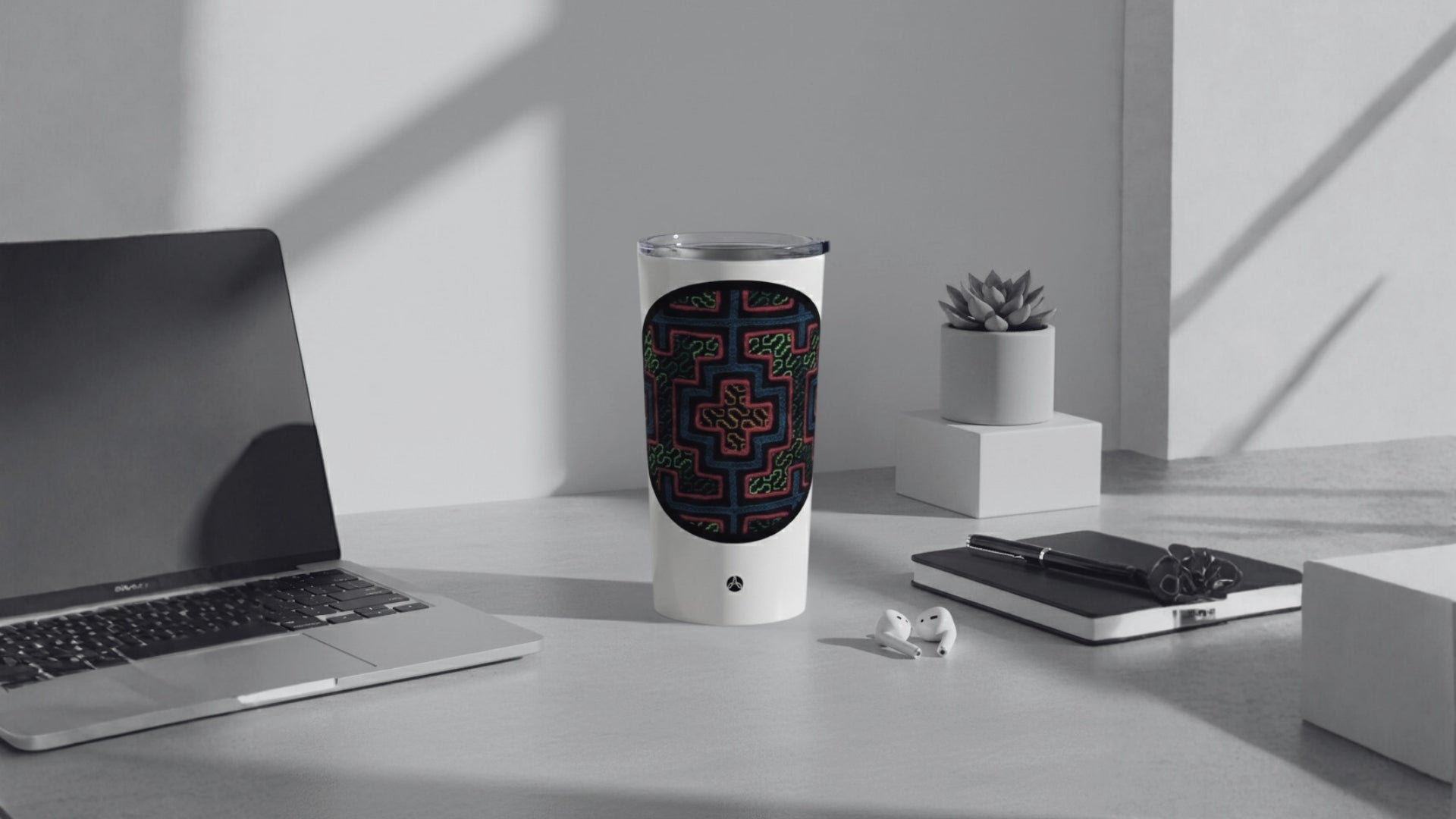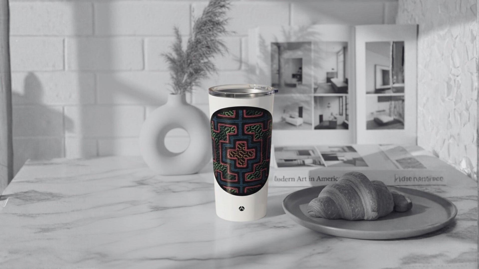 This travel mug features the Shipibo pattern Moatian Kené, based on an Icaro that speaks to the flow of memory and the healing properties of water. The flowing lines represent rivers, symbols of change, cleansing, and transformation. In Shipibo culture, memory is not static but moves, it is felt and passed through experience. This pattern carries the essence of that movement, a fluid remembrance of roots and transitions. As part of the SPIRIT NII SHINAN Collection, this mug brings the energy of that river with you into your everyday life.